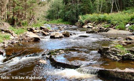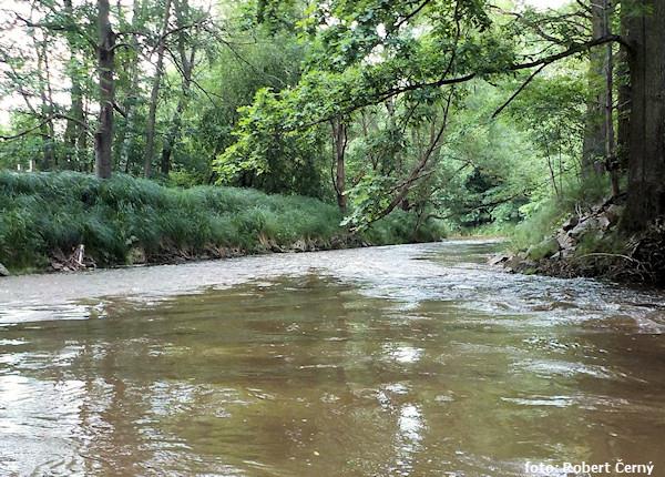 Blanice, úsek Záblatí/přehrada 8.6.2013, cca 9m3/s v Podedvorech, po povodni rozbitý jez u Zábrdskéh ...