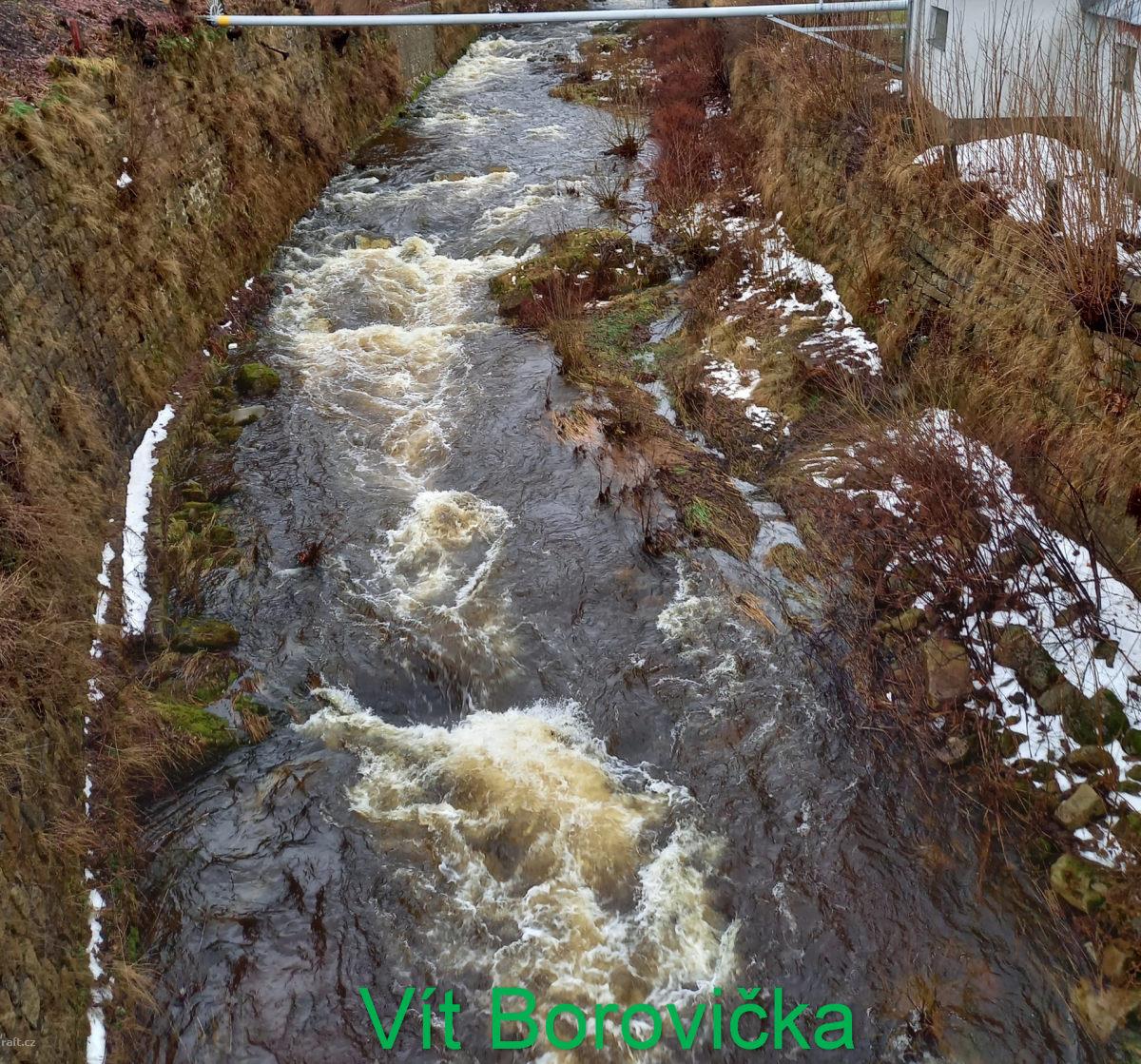 20.2.2023 Držkovské skoky, strom přes řeku 50m nad peřejemi v úrovni hladiny, za vetší vody jde pžez ...