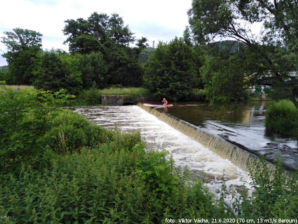 Litavka 31.7., vody již málo 22cm, jez na km19,1 po povodni je úplně protržený, před Lochovicemi je ...