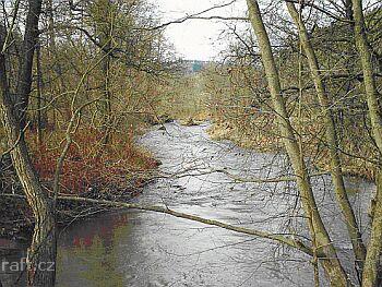 17,2 km Bělá lávka k fotbalovému hřišti od velké vody zatarasena klacky, začíná klidná voda před jez ...