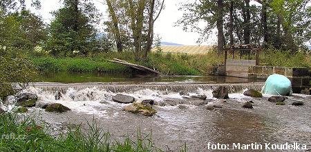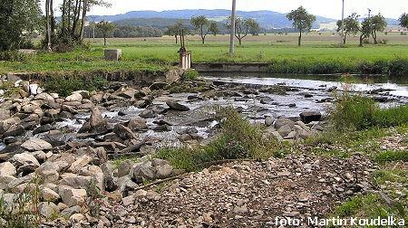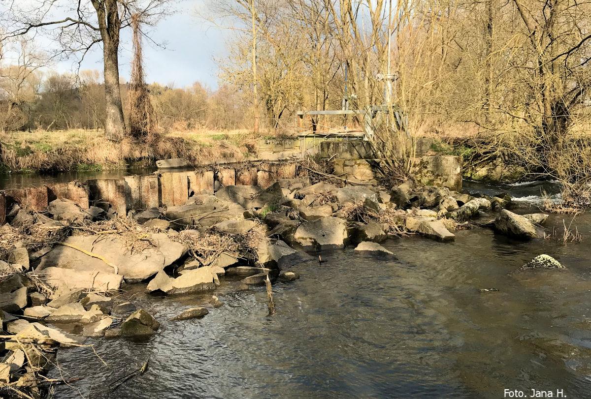 r.km 68,0 Poborovice - jez 22.3.2020, MZP= 1,02 m3/s, spád jezu je 1,95 m