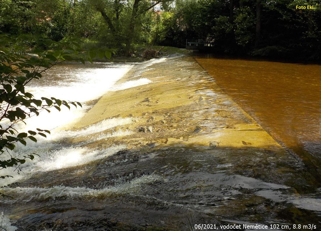 rkm.  Dvojitý jez s válcem pod pěší lávkou u vesnice Strunkovice