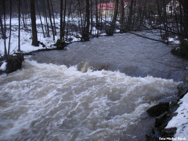 und folgenden 150 m niedrig Brücke Steg unbefahrbar , !! und folgenden 200m zufluss links Hluky, weiter pozor na padlé stromy!