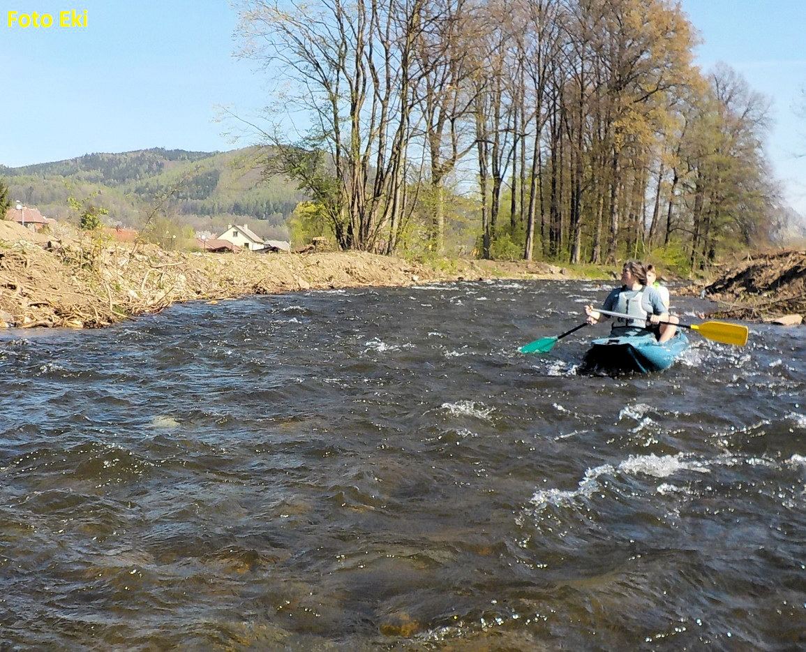 zerstörtes Wehr Stromschnelle befahrbar 1,2 km (GPS: 49.994905236,17.018079758) |