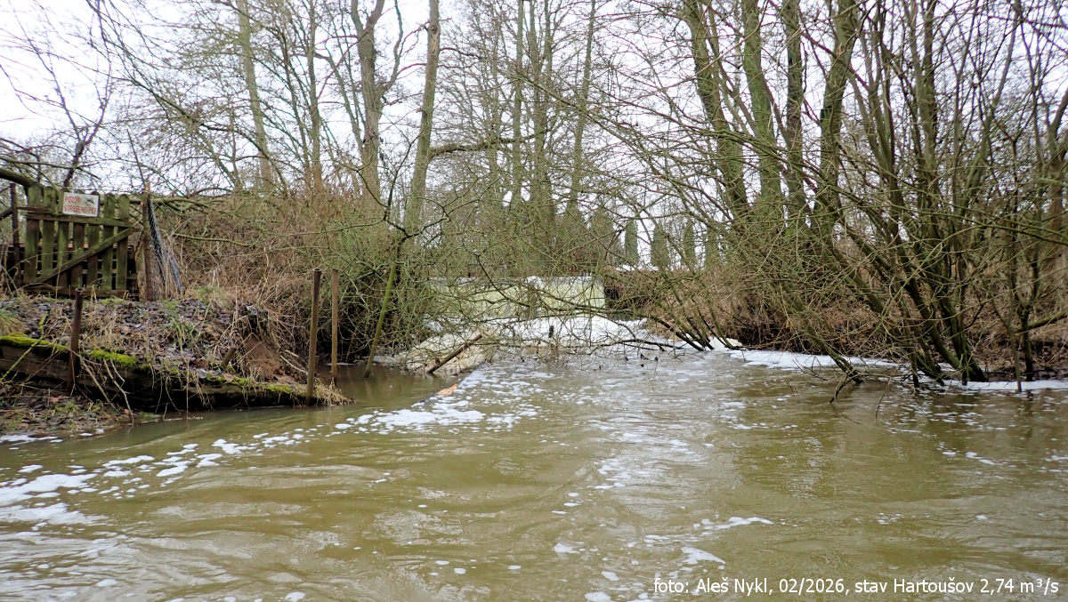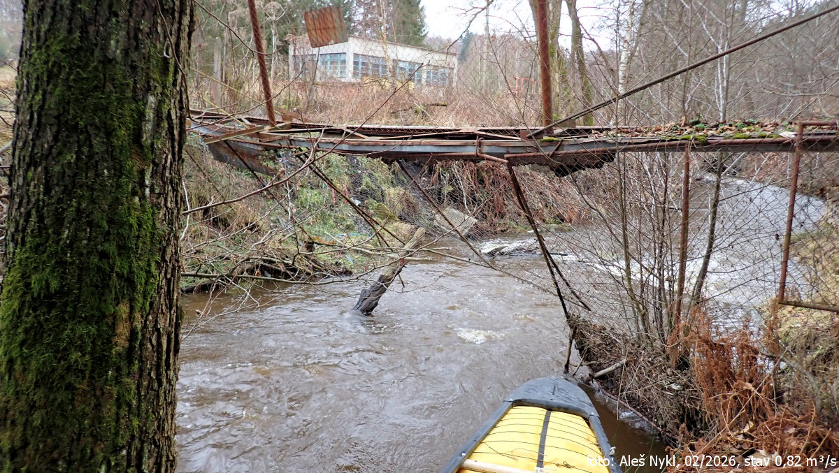 Jsou tři hodiny odpoledne, únorové dny ještě nejsou moc dlouhé, a i když mám s sebou slušnou čelovku, raději si dáváme jen kratší úsek. Začínáme v obci Libavské Údolí u mostu nad továrnou. Místní vodočet ukazuje 0,82 m³/s. To je trochu zklamání – čekali jsme víc, ale holt Slavkovský les, ze kterého teče, nemá takovou nadmořskou výšku jako Krušky. A sněhu už tam asi také není tolik.