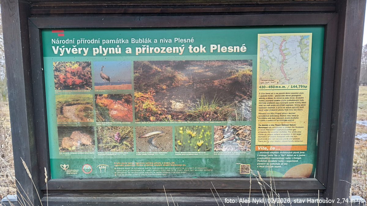 Začali jsme na Plesné. Na této říčce jsme byli už před dvěma lety. Tenkrát jsme si dali jen poslední cca 3 km úsek do Ohře a řekli si, že se rozhodně chceme vrátit. Dnes jsme na vodu vyrazili v Milhostově, cca uprostřed NPP Bublák a niva Plesné. Vodočet v Hartoušově ukazuje 2,74 m³/s. Koryto je plné, místy se voda lehce rozlévá do okolních luk.