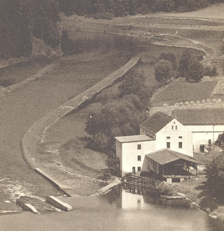Mlýn a jez v Podolsku na Vltavě, dnes zatopeny přehradní nádrží (L. Sitenský: NA ŘEKU…! 1957)