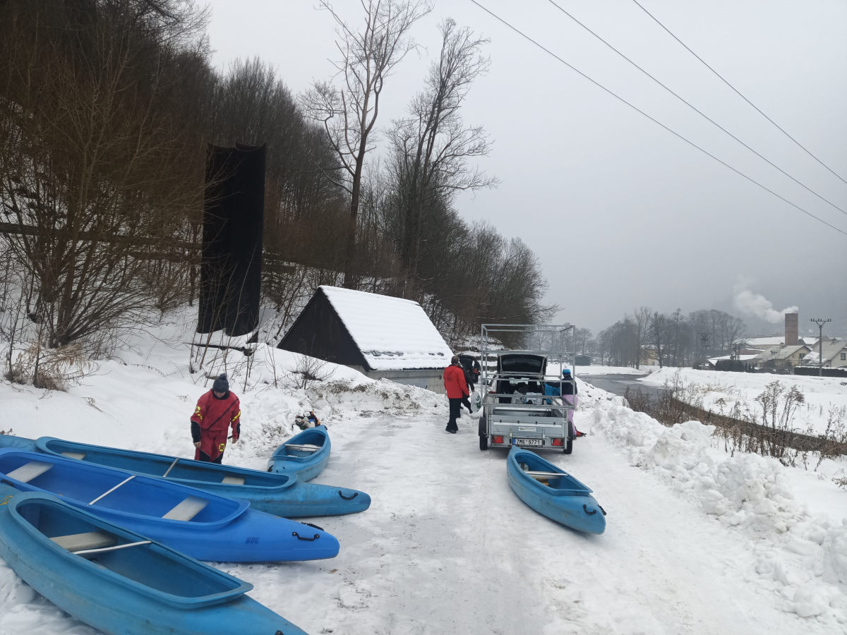 Druhý den v sobotu ráno přijíždíme po zledovatělé silnici k „nové“ klubovně vodáckého klubu, protože v té původní udělala povodeň z roku 2024 pořádek. Vodáci totiž nebývají moc pořádkumilovní, kupí různé staré relikvie, které posléze není kam dávat, proto byla nutná jejich revize. Členům se do toho moc nechtělo, tak to za ně udělala voda, která jim odnesla také velký kontejner s věcmi na tábor včetně nerezové kuchyně a vojenského stanu.