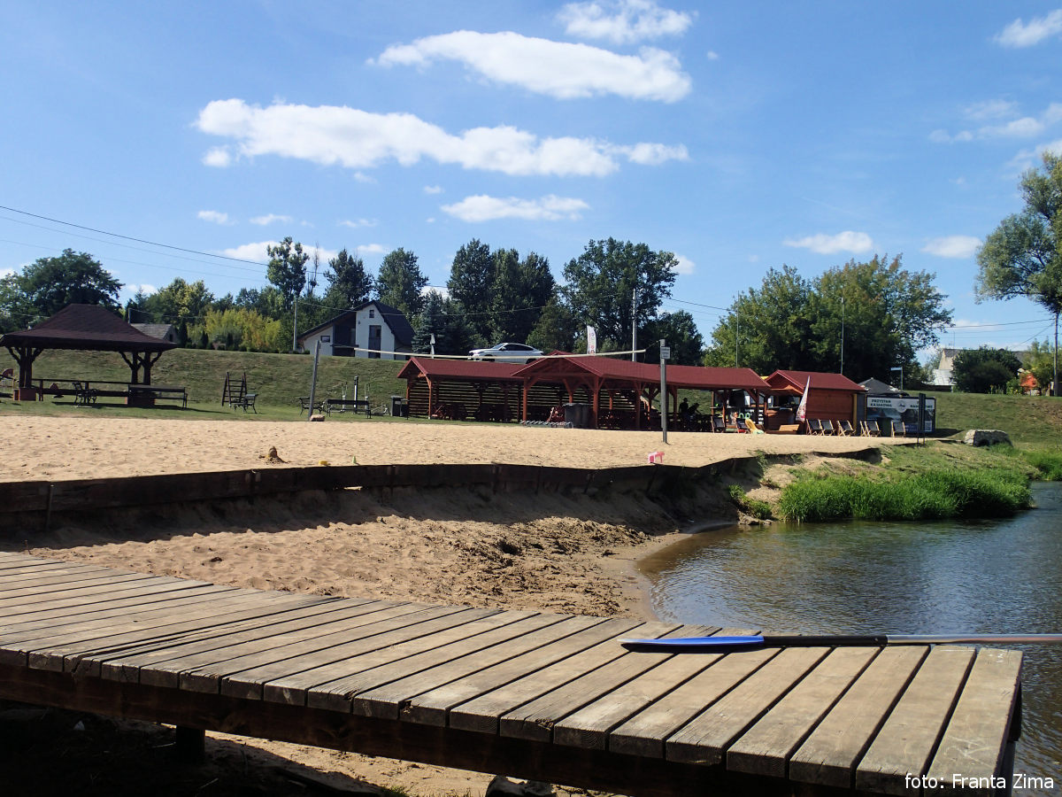 Kolem 17 hodiny jsme se zastavili na nákup v Dzialoszyně. Hned na kraji města se řeka rozdvojuje do dvou ramen a je zde na levém břehu tábořiště. My jsme jeli kvůli nákupu pravým ramenem. Pak jsme museli před elektrárnou přetáhnout vodou lodě do ramena levého a shodit je pod hráz. Tábořili jsme v Lisowicích. Tábořiště je na levém břehu, ale je třeba odbočit do úzkého ramene, které jsem považoval za přítok, a tak jsme se museli od mostu vrátit kousek proti proudu. Jsou zde dva velké altány s lavicemi a stolem, a tak jsme ani nestavěli stany a vyspali se tam.
