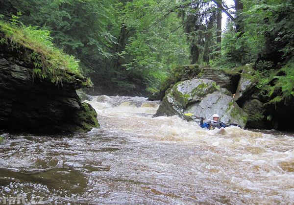 20.2.2023 Držkovské skoky, strom přes řeku 50m nad peřejemi v úrovni hladiny, za vetší vody jde pžez ...