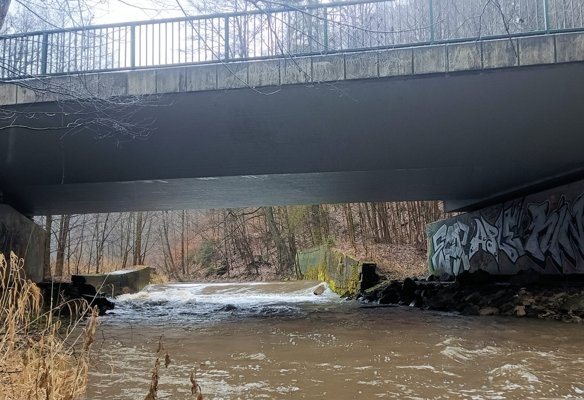 Brücke Strassen Aussatztelle, (340 m. n. m.) začátek peřejnatého úseku 3,6 km (GPS: 50.394525759,16.155154109) |