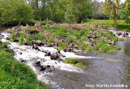 r.km 68,0 Poborovice - jez 22.3.2020, MZP= 1,02 m3/s, spád jezu je 1,95 m